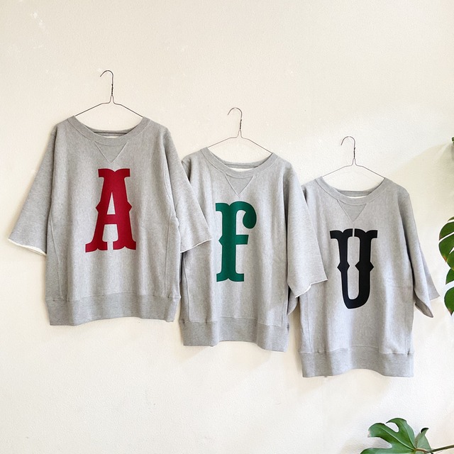 昔のアメリカフォントを使用しアルファベットをプリントしました。 五分袖はカットオフデザインです。両脇にリブを使用 背面の襟元にはレザーと真鍮を使用したタグがあしらわれており、ブランド名が刻印されています。 【サイズ】 着丈62 身幅56 肩幅40 袖丈40 袖口22 【素材】 本体 COTTON 100% 付属 牛革 真鍮