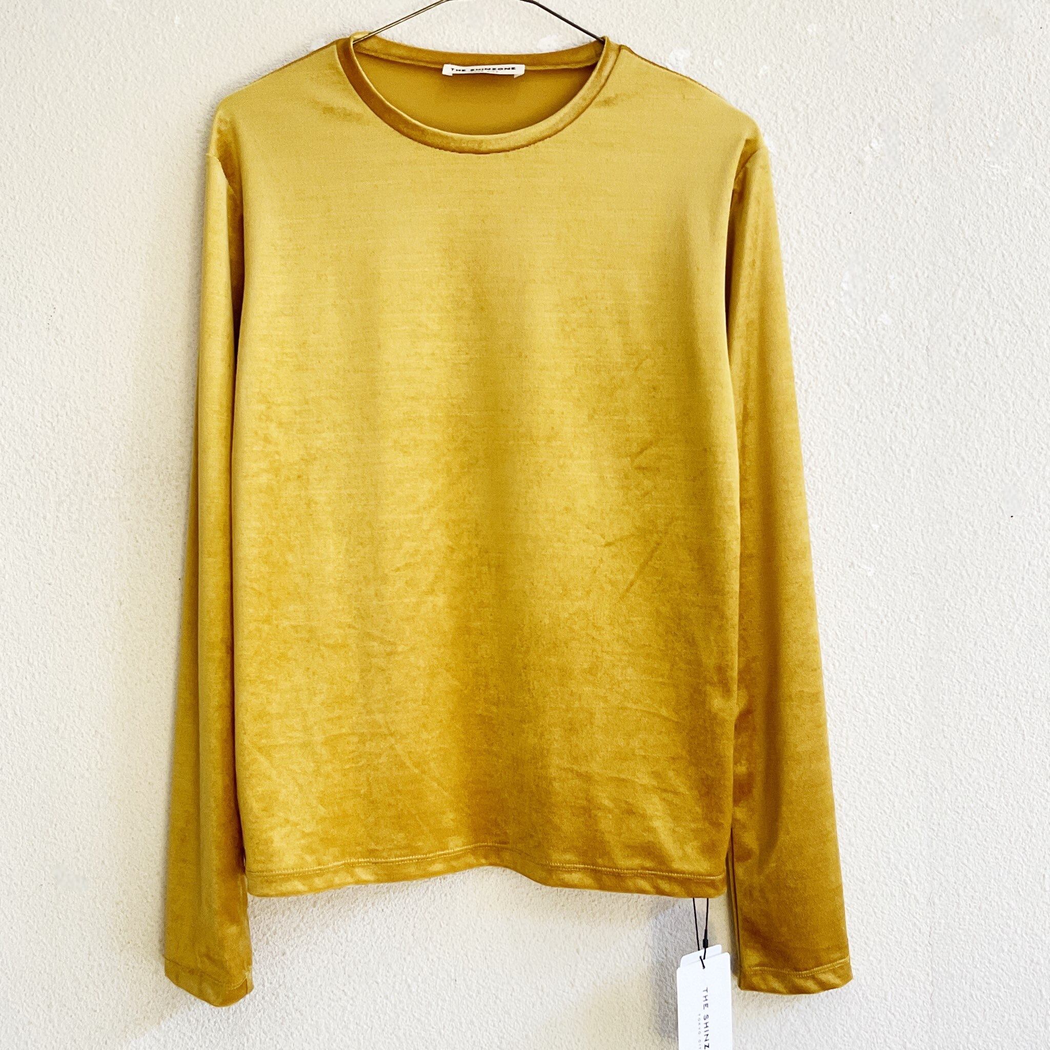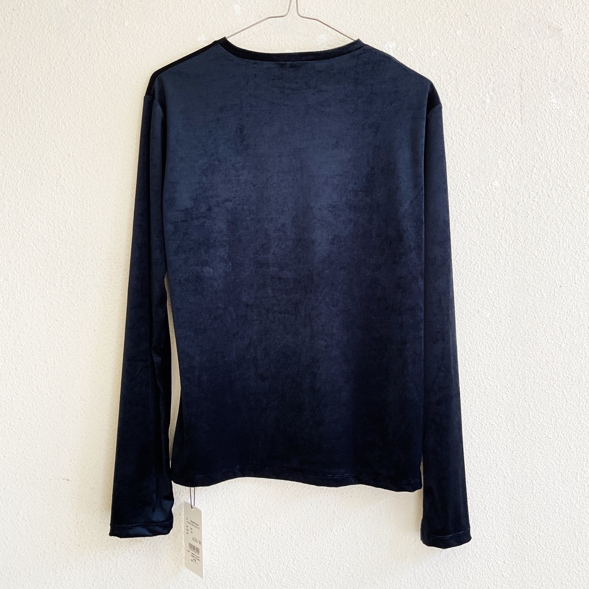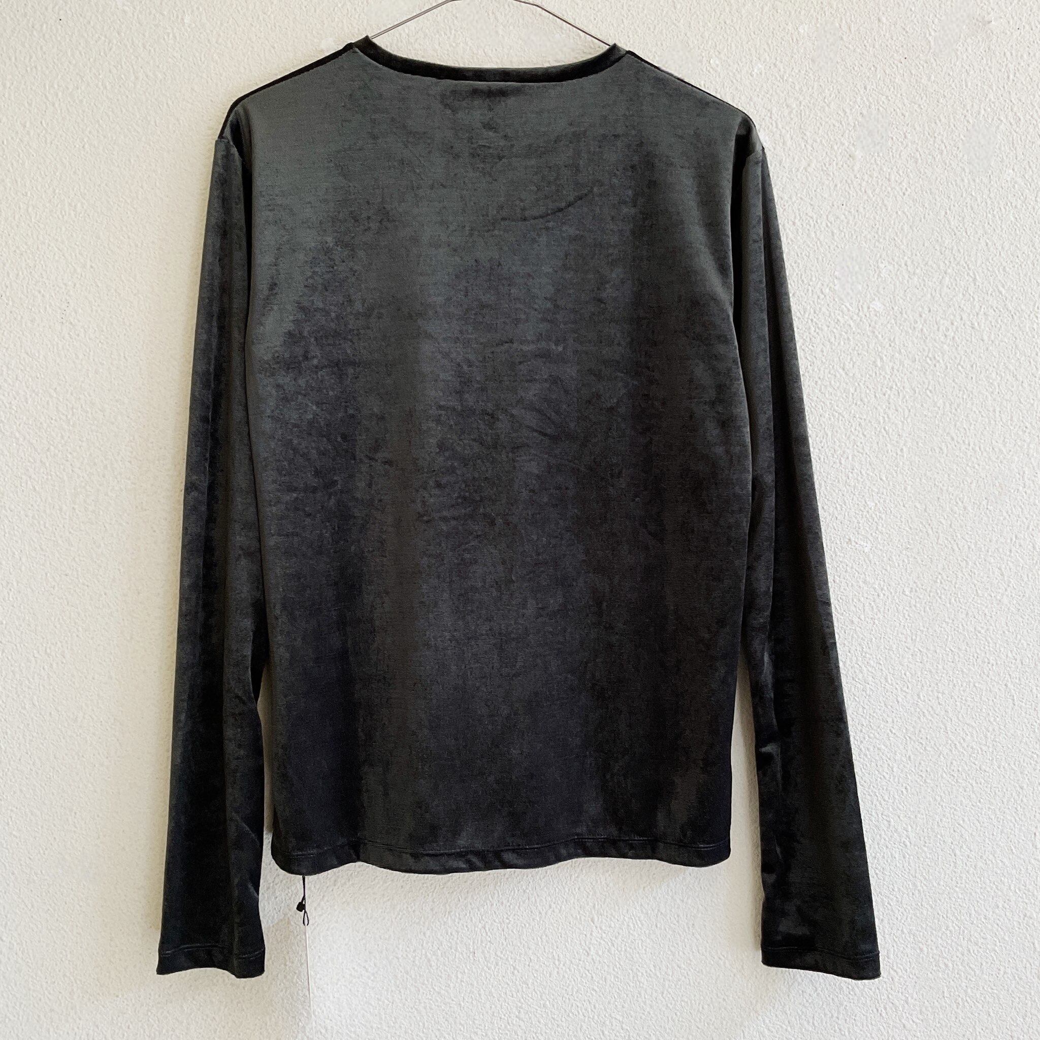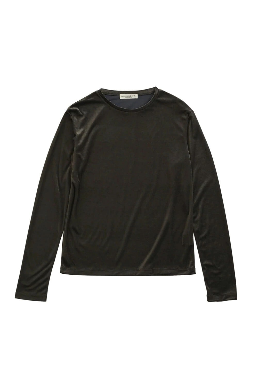 光沢感とドレープ性の高いトリアセテート素材のベロア生地を使用した長袖Tシャツ。