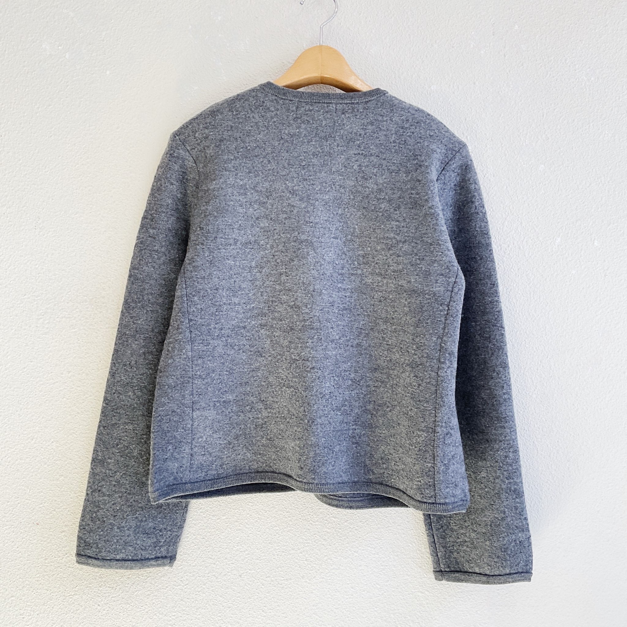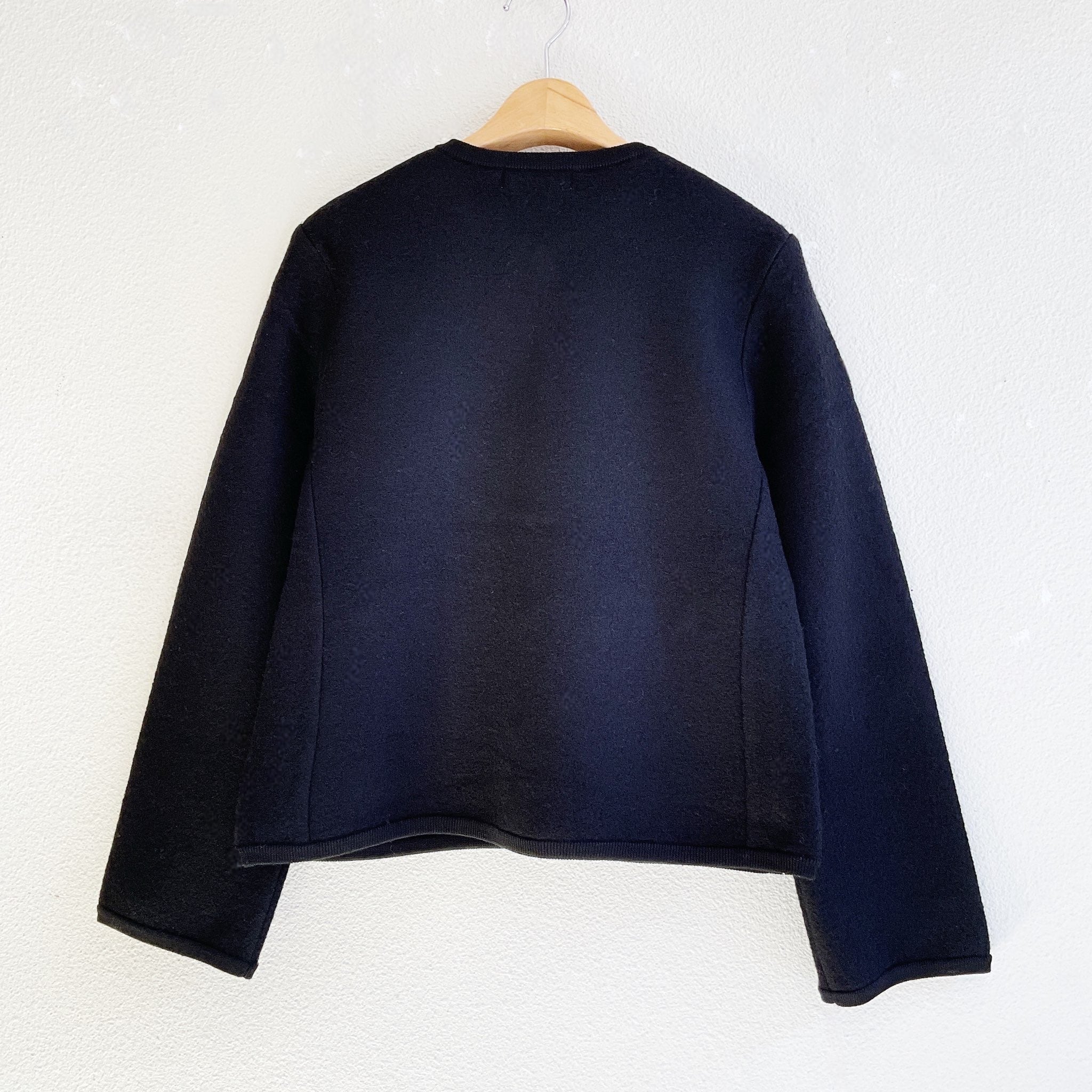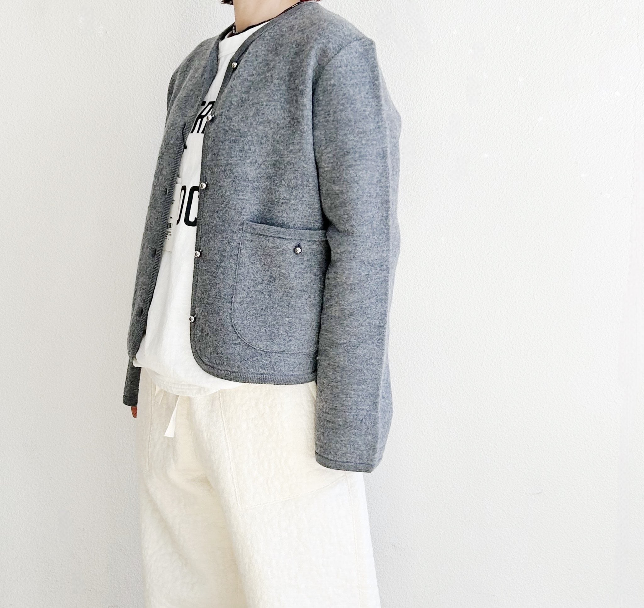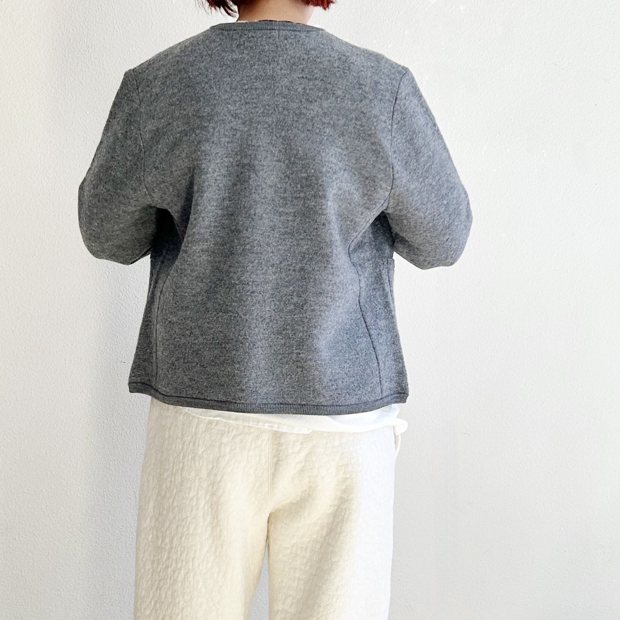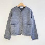 細番手である2/48のウール糸を14Gで編み、さらに強縮絨加工をかけてしっかりとした肉感に仕上げた、軽くてあたたかなニットカーディガン。