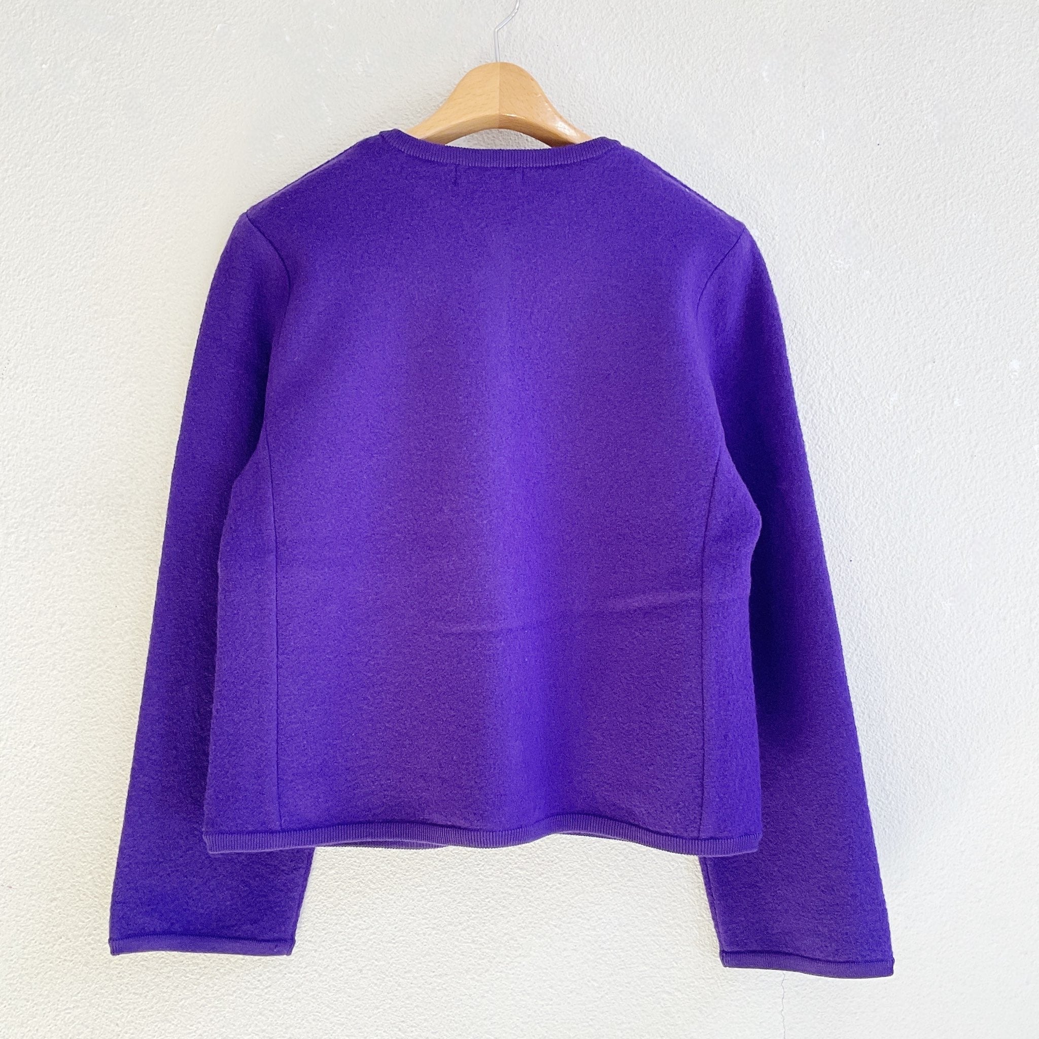 共糸のテープで襟ぐりから裾にかけてぐるりとパイピングしました。コロンとした丸いボタンがアクセントになっています。今シーズンのキーカラーのパープルと、使いやすいベーシックカラーがラインナップしました。