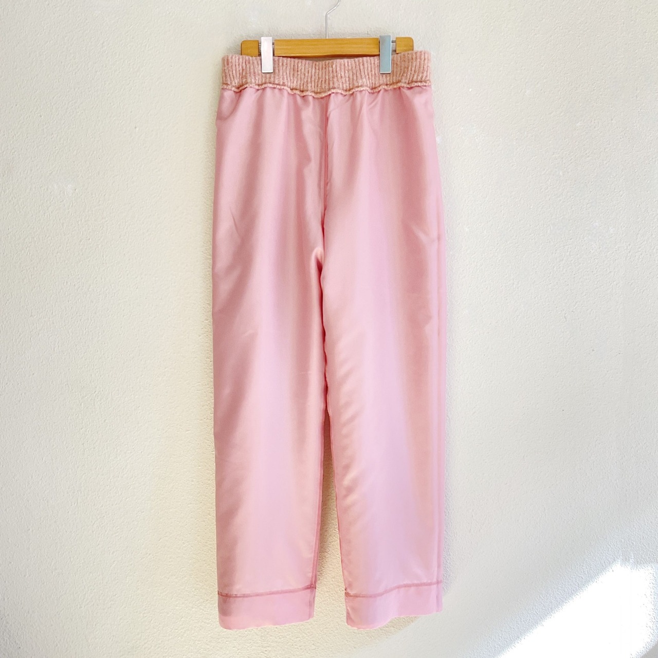 ウェスト部分から裾まで二重になっていて、裾から少し別生地が出ているのがポイント。ウエストはゴムとドローコード仕様で快適な着心地。