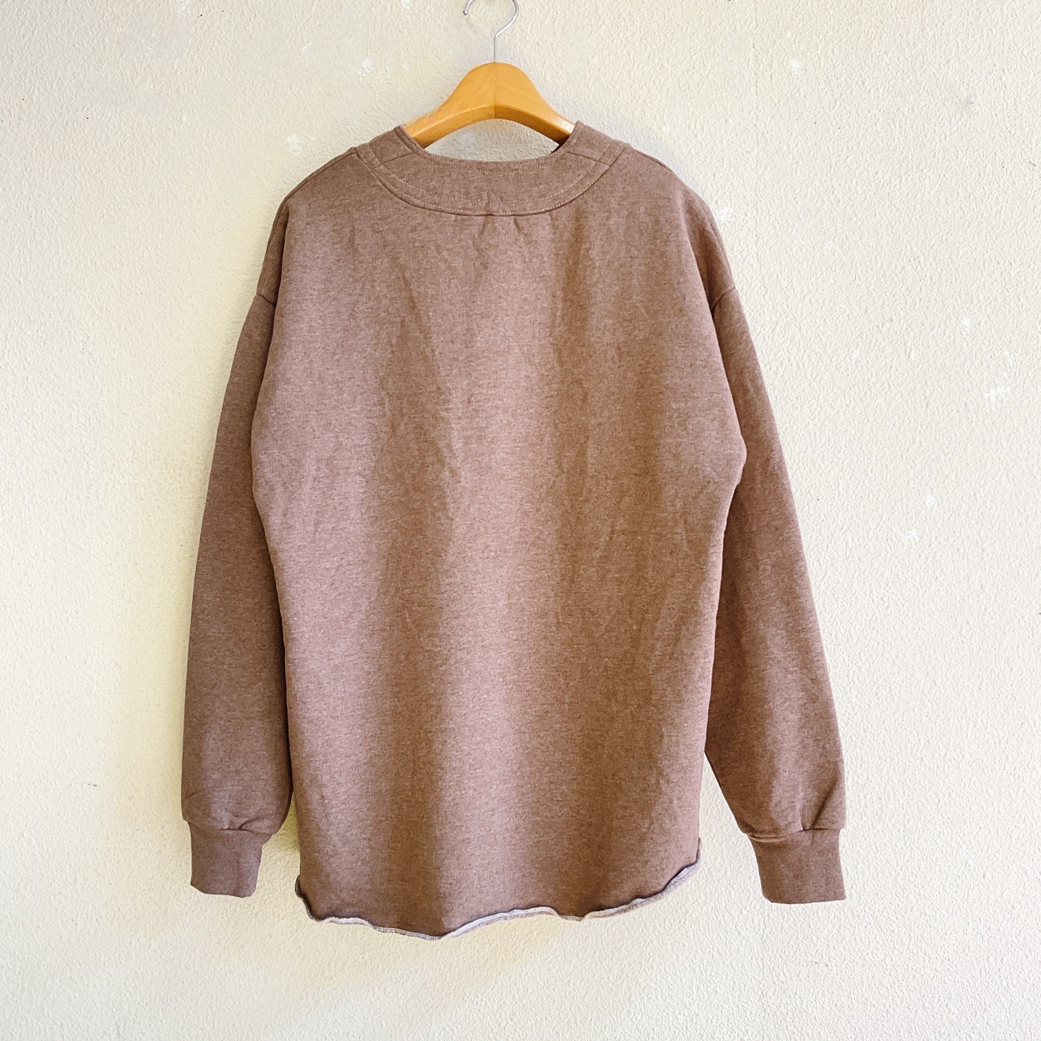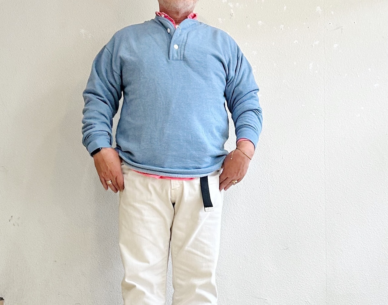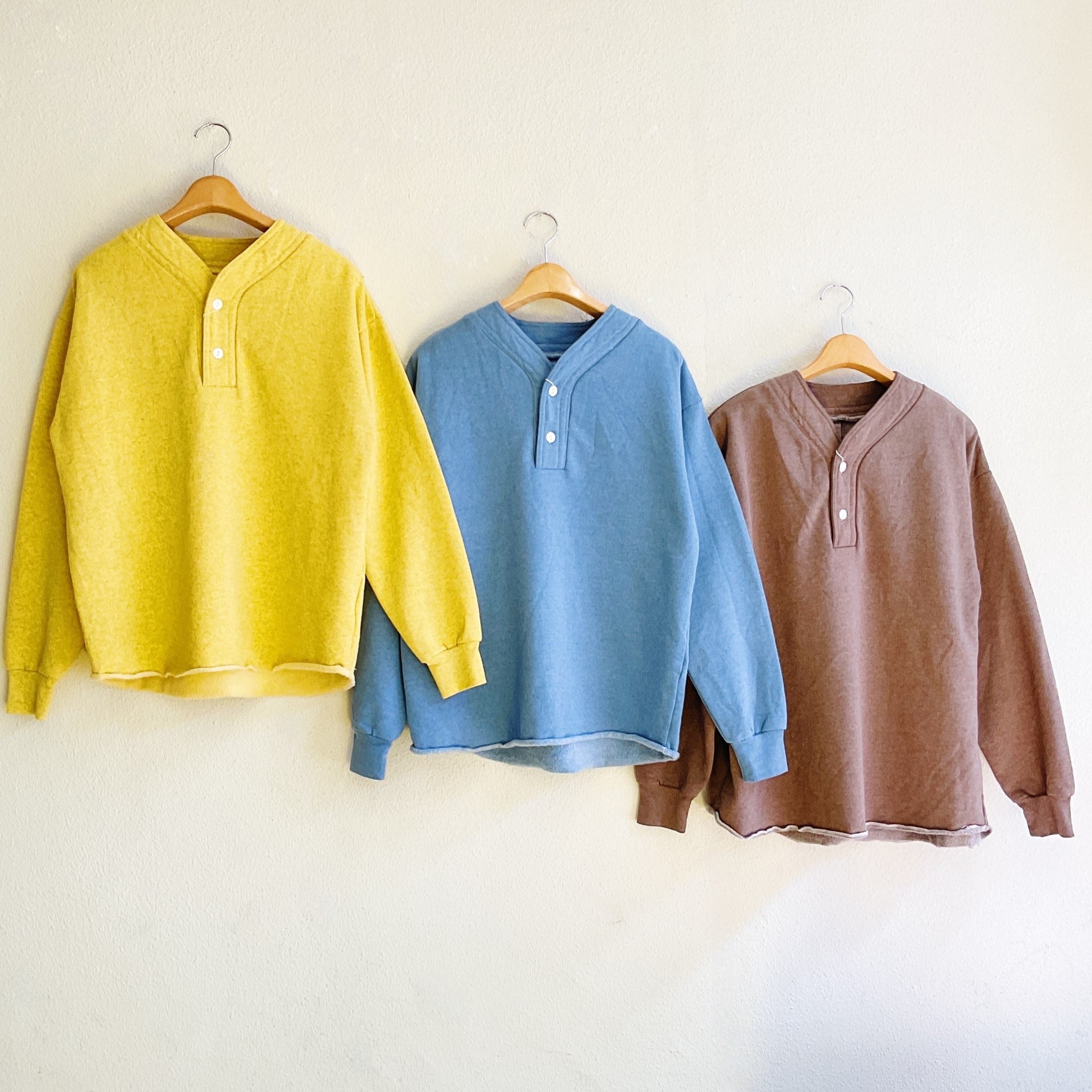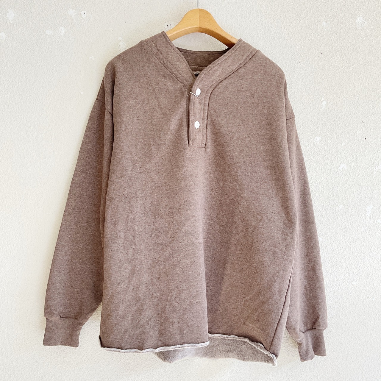 裾部分は切りっぱなしで仕上げています。カジュアルながらもクラシックなデザインに落とし込みました。ベーシックなスタンダードフィットの、HIGH! STANDARDが提案する新しいヘンリースタイルです。コーディネートの差し色になるよう、明るいメランジェ調のグレーで製品染めを施しました。
