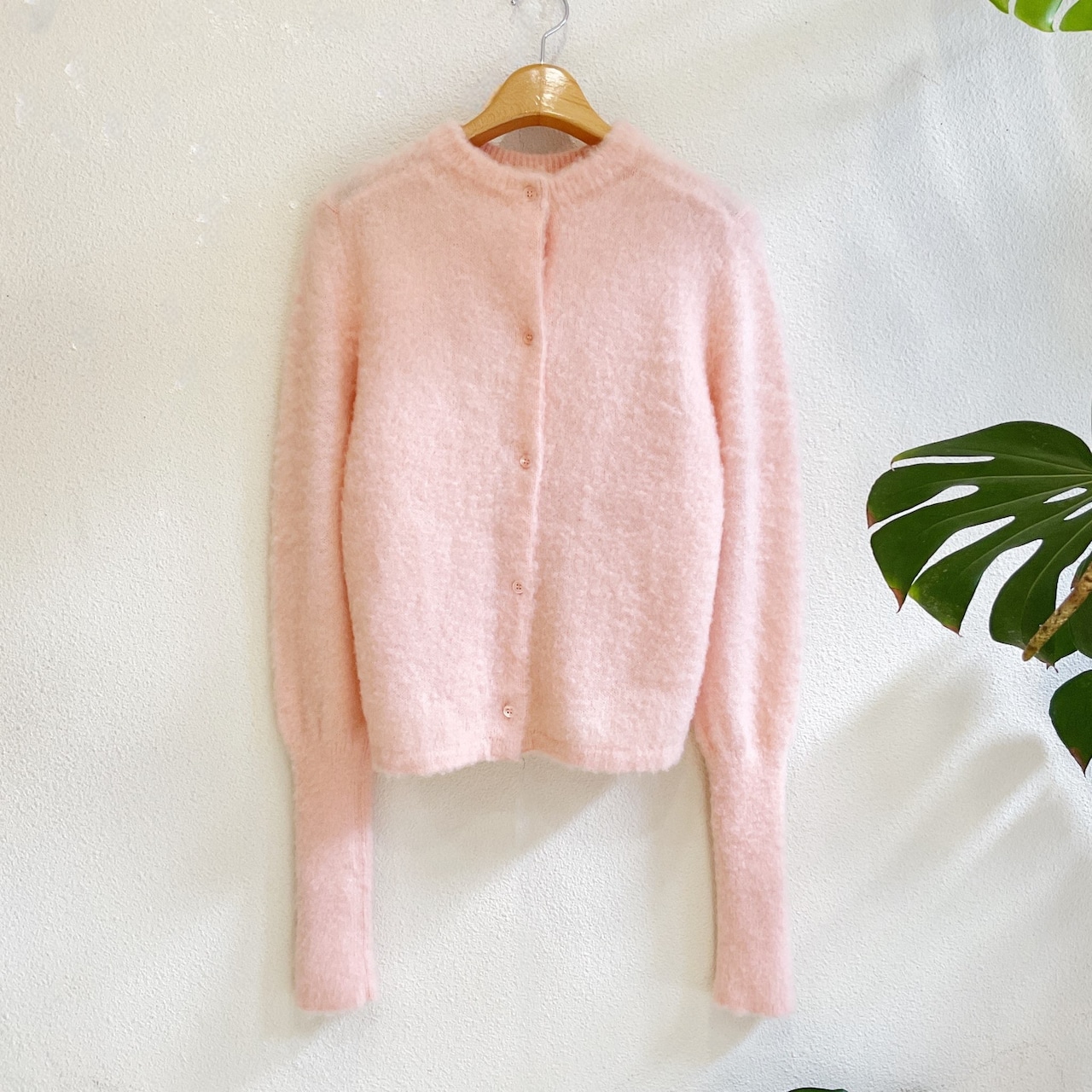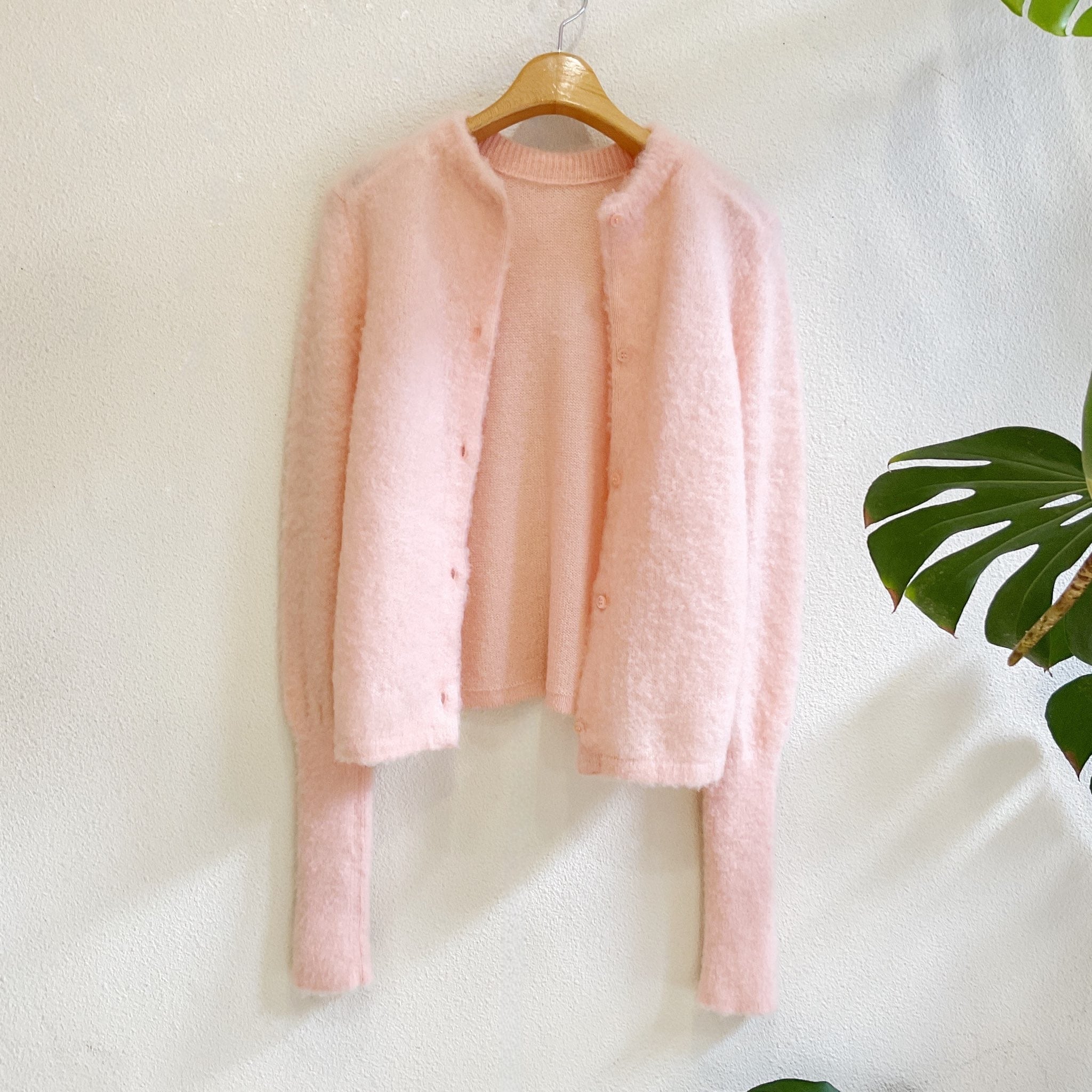 プルオーバーとしてもカーディガンとしても着られるので一枚で二度楽しめるデザインです。前後どちらで着たときもボタンの開け閉め具合で色んな表情に。